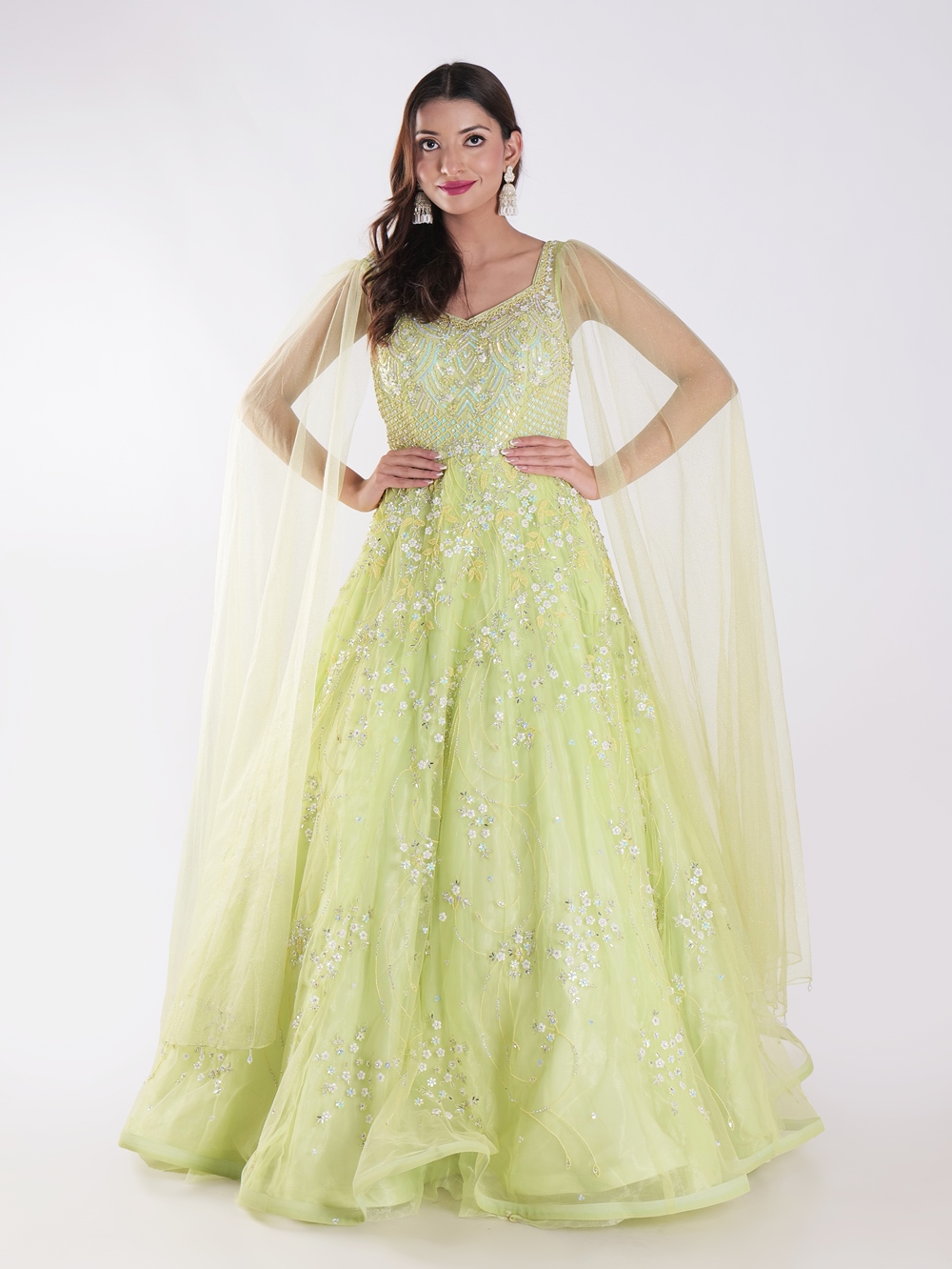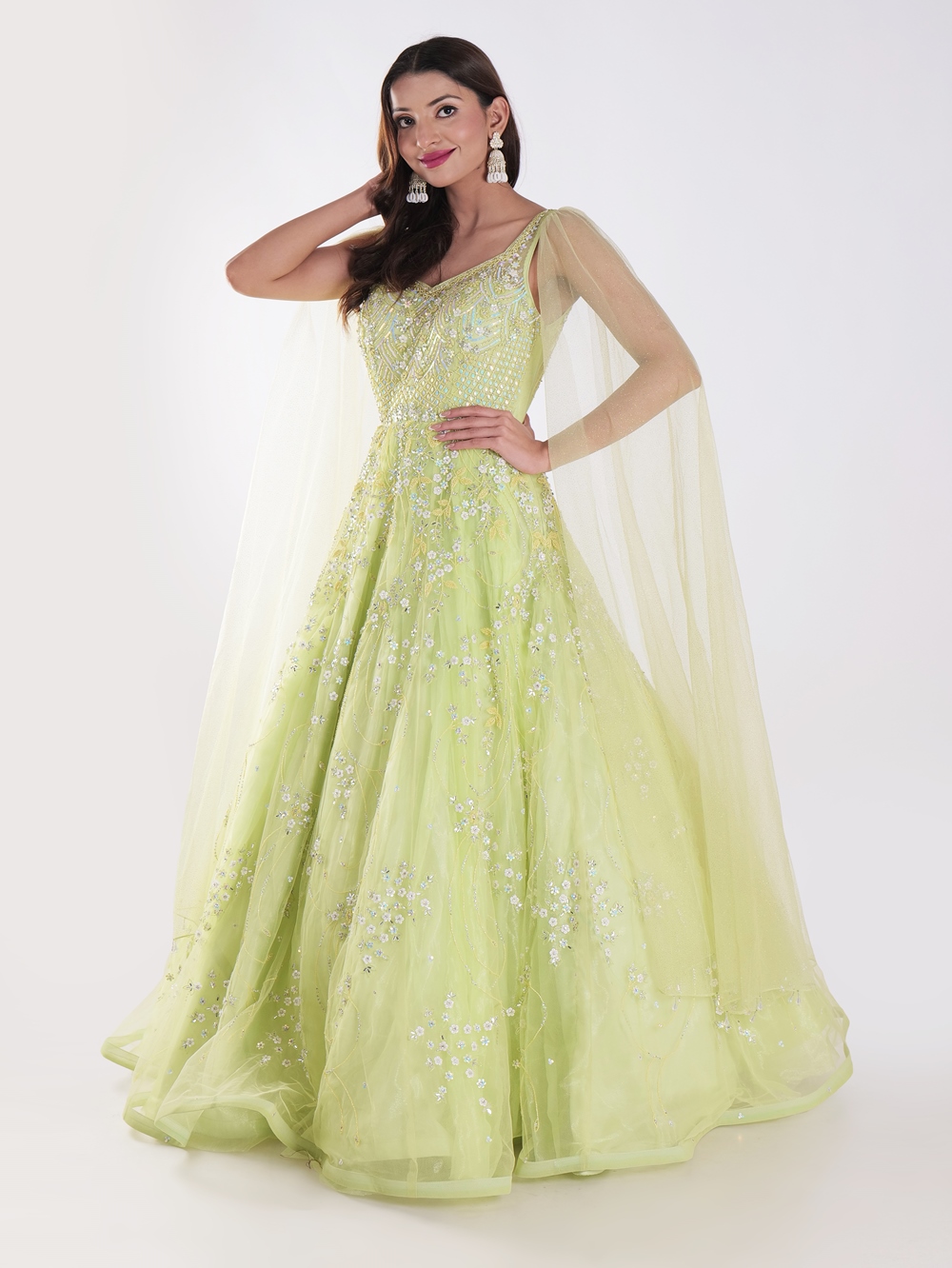 A Beautiful Light Green With Delicate Embroidery And Embellishment Cocktail Party Wear Gown