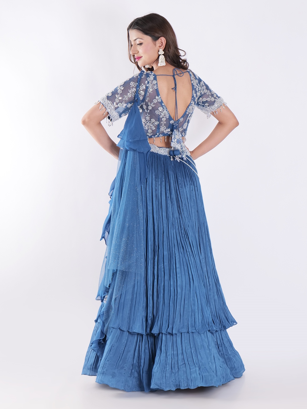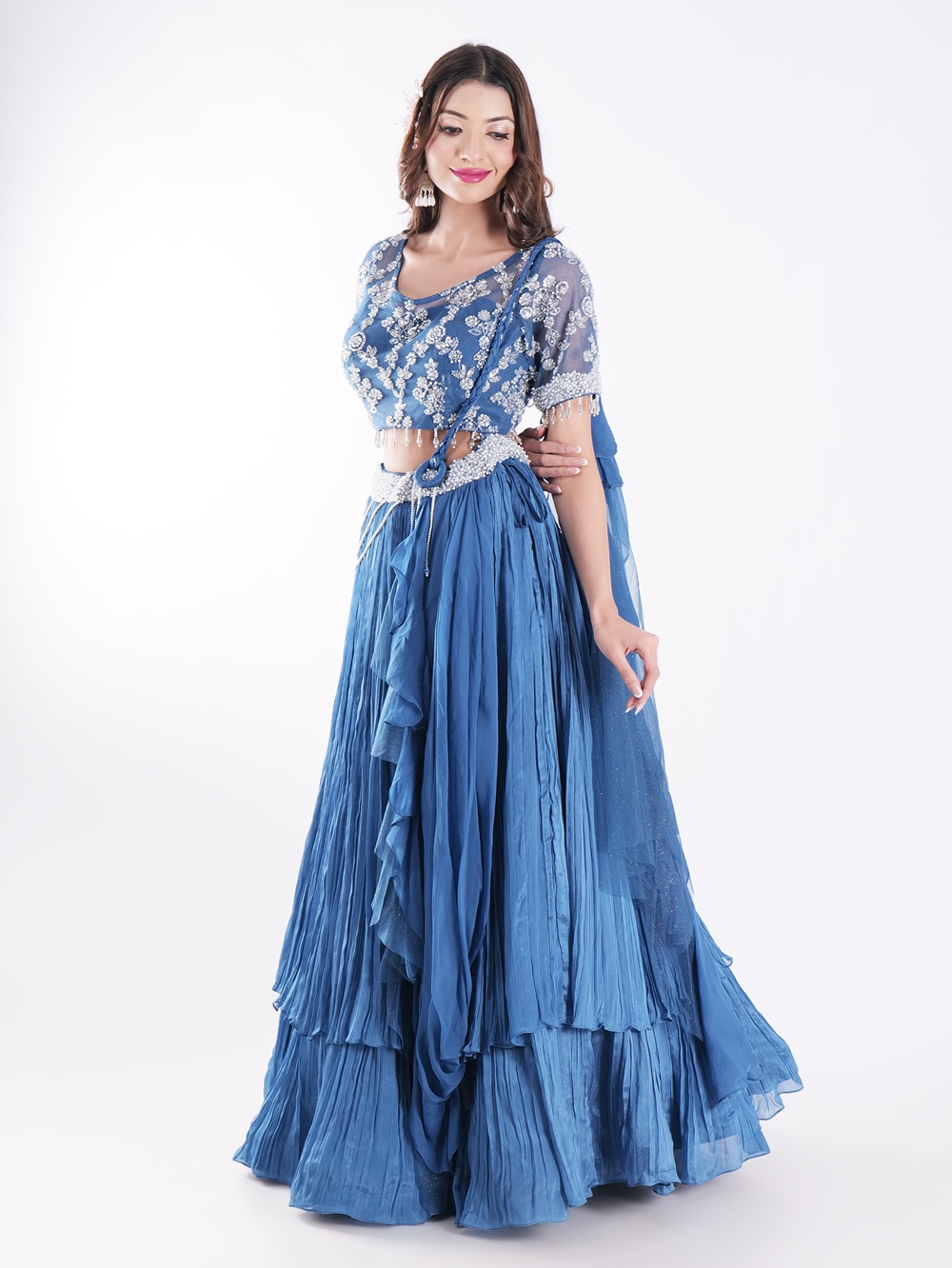 Beautiful Blue Outfit Adorned With Intricate Silver Embroidered Indo Western Lehenga Set