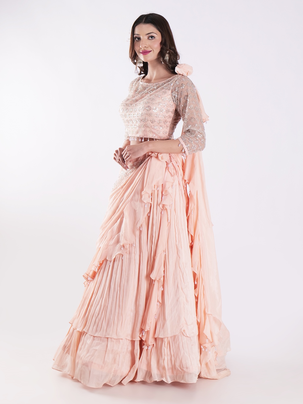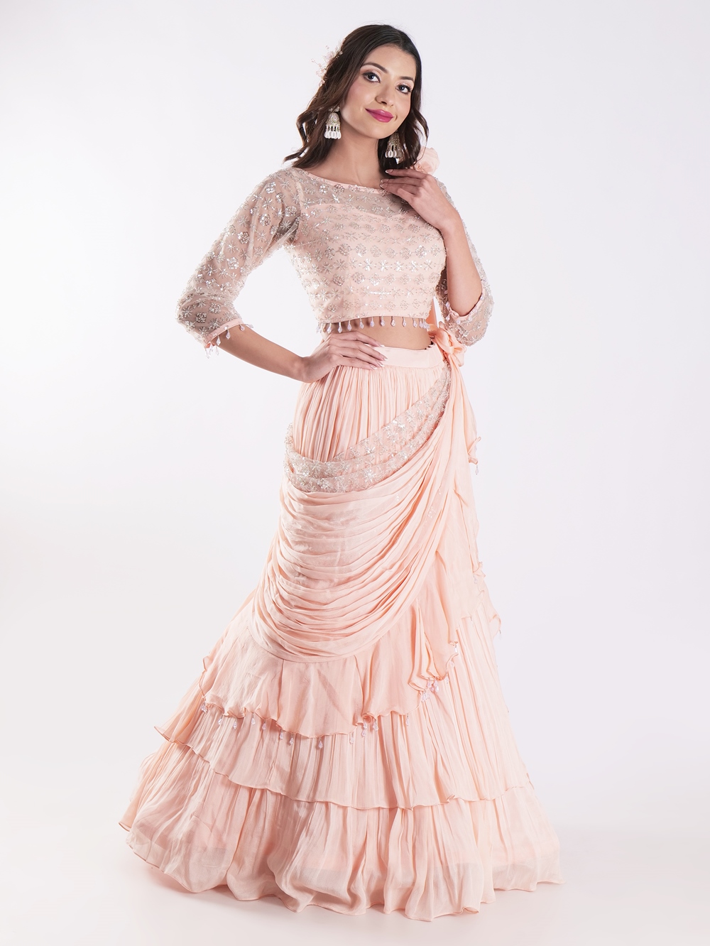 Beautiful Peach Colored Embroidered Crop Top Outfit Ruffle Drape Lehenga Set