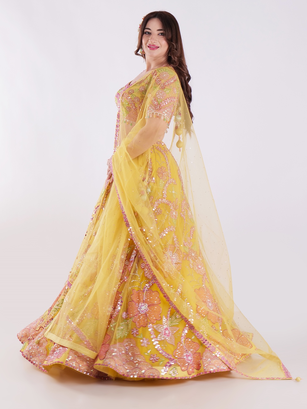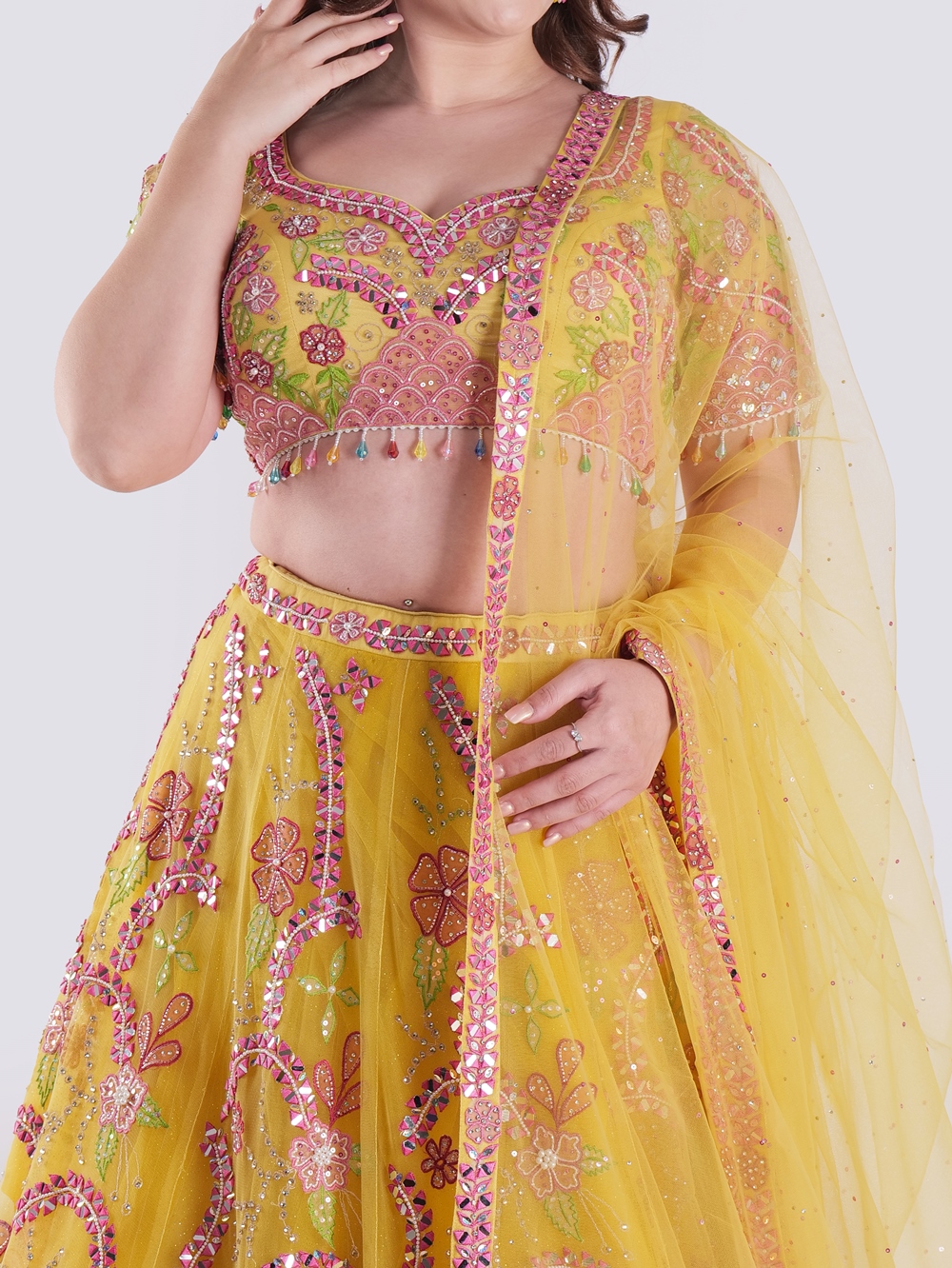 Radiate Sunshine In Style Yellow Floral Embroidered Mirror Work Lehenga Choli Set