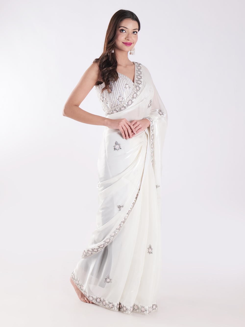 White Party Wear Saree With Silver Embroidery